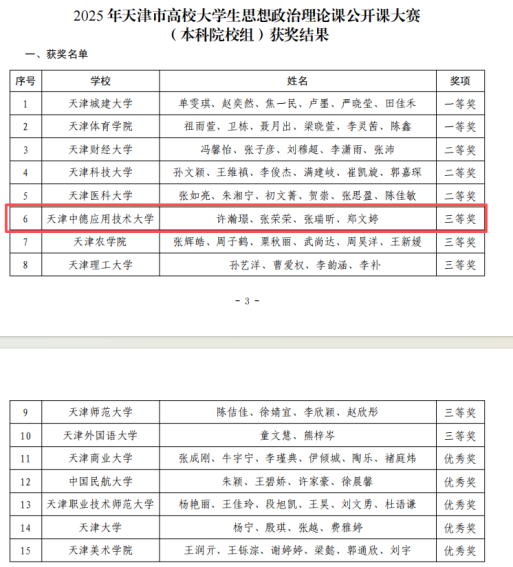近日,“弘扬抗战精神·砥砺复兴力量”天津市高校大学生思想政治理论课公开课大赛圆满落幕。大赛自5月份启动以来,经过校级初赛的选拔、市级复赛的角逐,最终15所高校的15支团队在全市91支参赛队伍中脱颖而出。我校许瀚璟、张荣荣、张瑞昕、郑文婷四位同学组成的参赛团队,在郭文汇老师团队的精心指导下,不仅以《清澈的爱,只为中国 —— 五四新疆实践行》从众多作品中强势突围,更实现了我校在该赛事本科决赛舞台上的首次亮相,最终斩获大赛第六名、三等奖的优异成绩,以突破性成果诠释了新时代青年的家国担当,展现了我校思政实践育人成效。